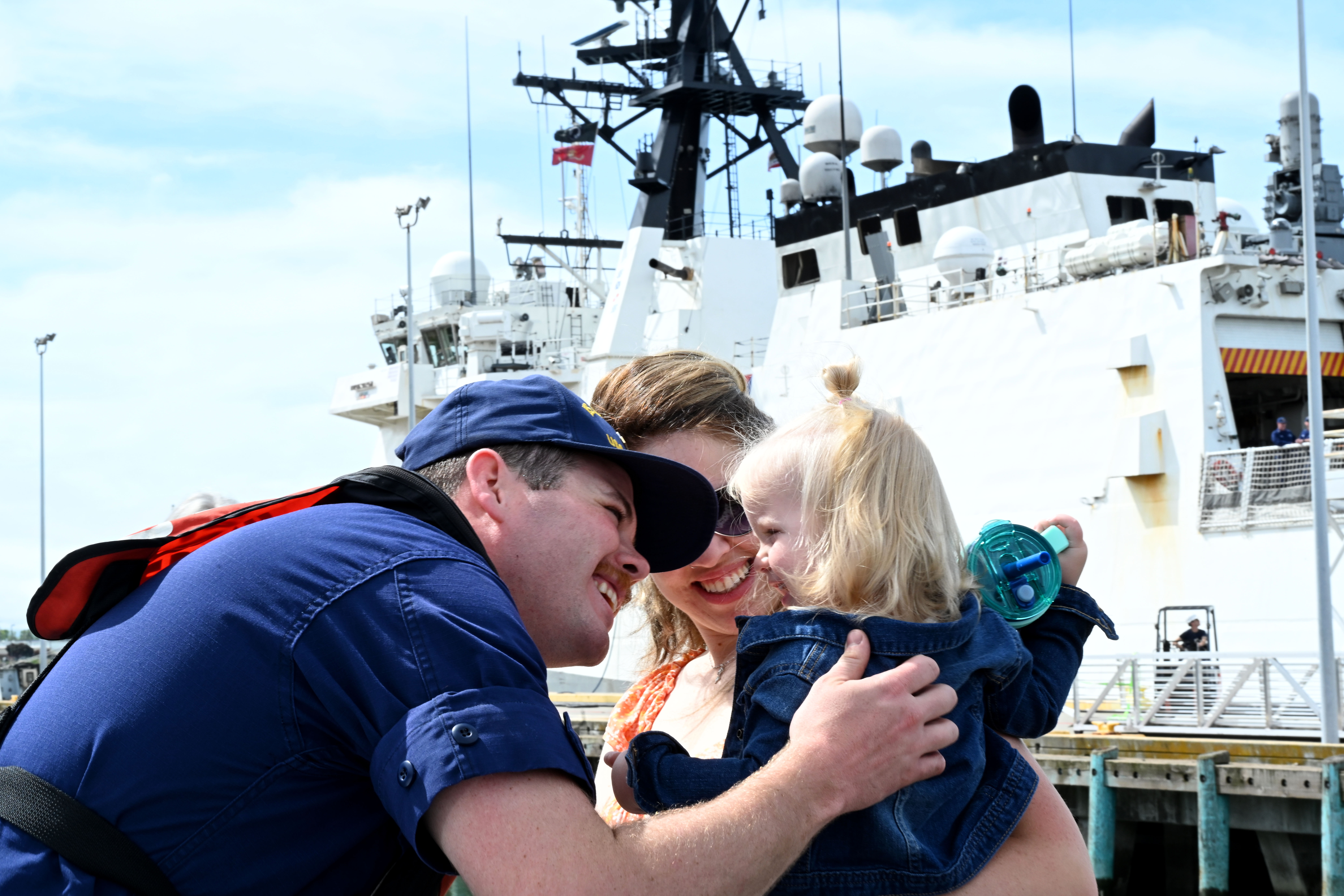 A U.S. Coast Guard member reunites with family after the Cutter Munro returned to its home port at Base Alameda, California, on June 3, 2024, following a four-month patrol. U.S. Coast Guard photo by Chief Petty Officer Matthew Masaschi.
